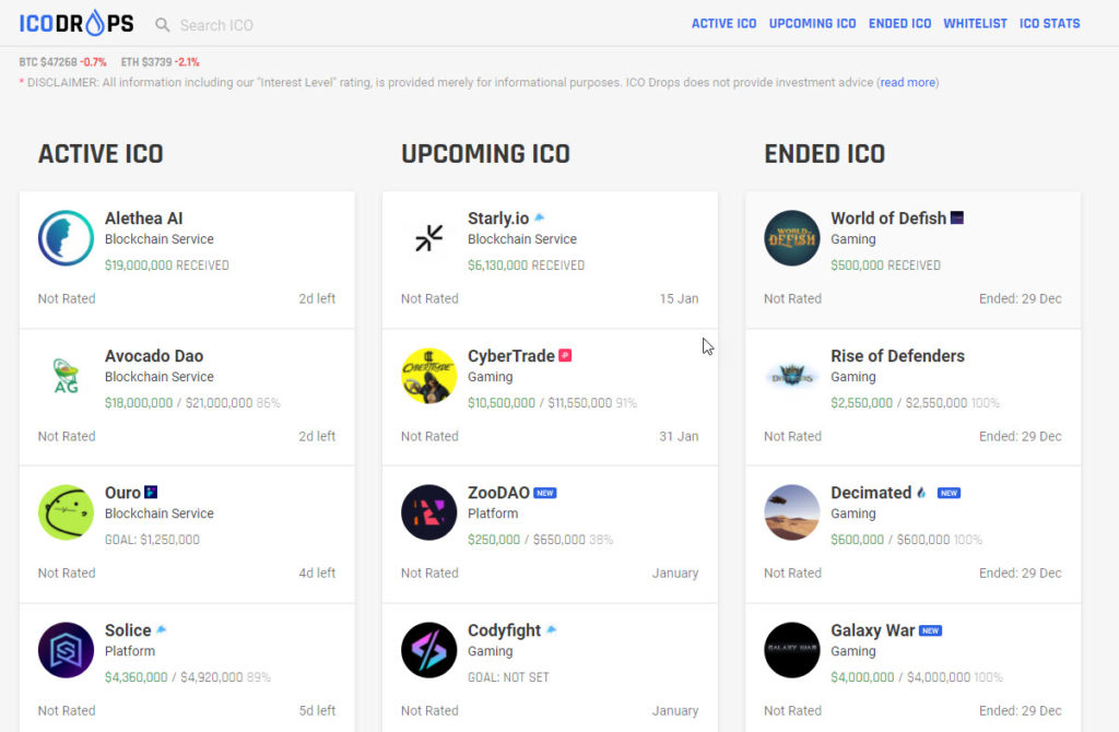 If you are lucky you will stumble upon crypto came into being by a fair launch like bitcoin realistically though you are going to spend bit of a time from the bad premine cryptos using an ICO tracking site like ICO drops is a good place to scout out current and future ICO these sites tend to provide short and concise definitions of what the project is all about and let you know if you are eligible to participate.